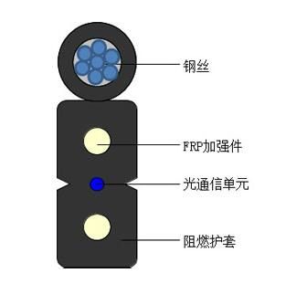 自承式接入網(wǎng)用蝶形引入室內(nèi)光纜是將光通信單元處于中心,兩側(cè)放置兩根平行非金屬加強元件(FRP),在外側(cè)再附加一根鋼絲加強元件,最后,擠制黑色或彩色低煙無鹵護(hù)套成纜。